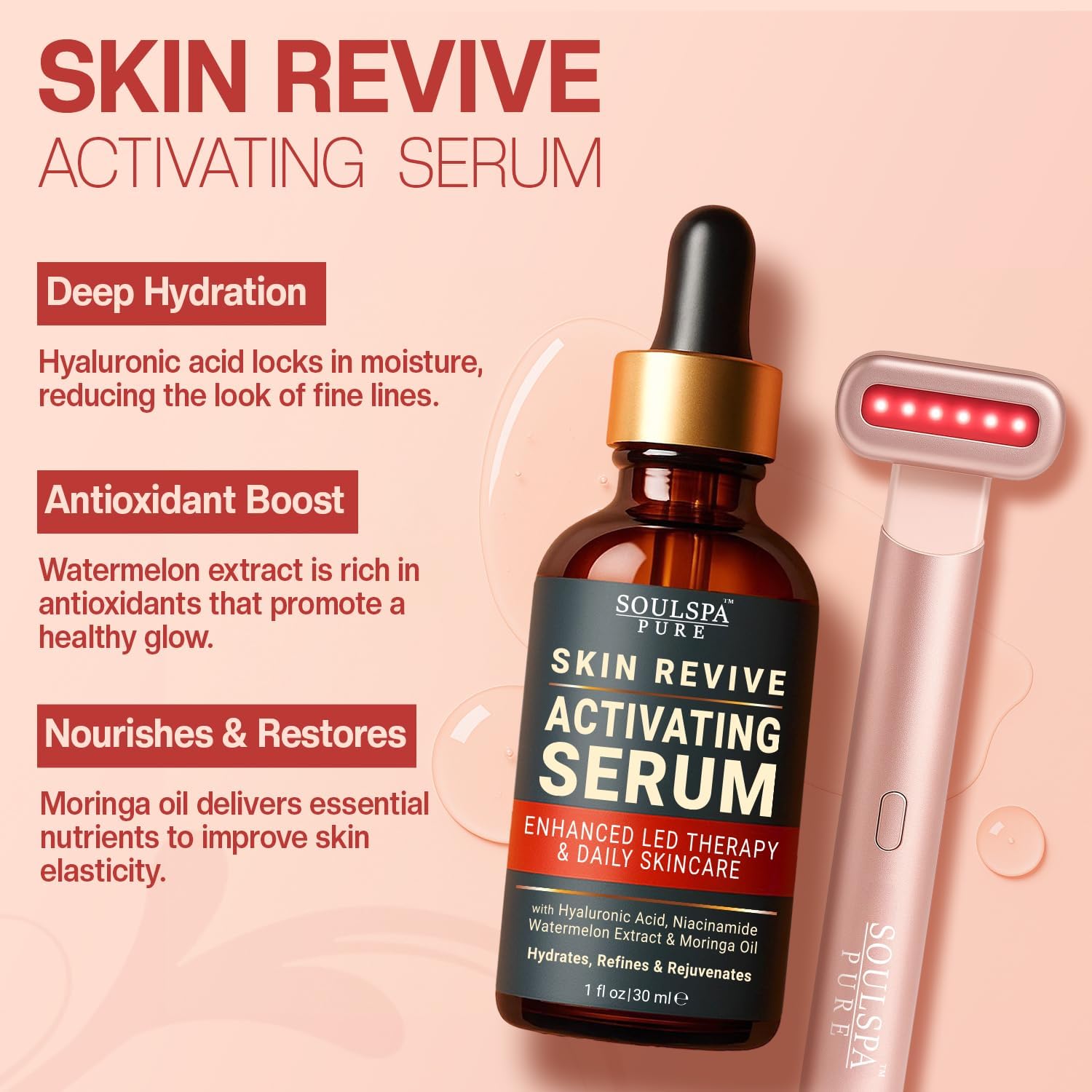 Transform your skincare with the SoulSpa Pure LED Wand, a 7-in-1 facial device designed to rejuvenate and refresh your complexion. Combining LED light therapy, facial massage, and gentle vibration, it enhances absorption of skincare products and promotes a youthful, radiant glow. The wand comes with an activating facial serum, specially formulated to work in harmony with the device, delivering maximum hydration and visible results.