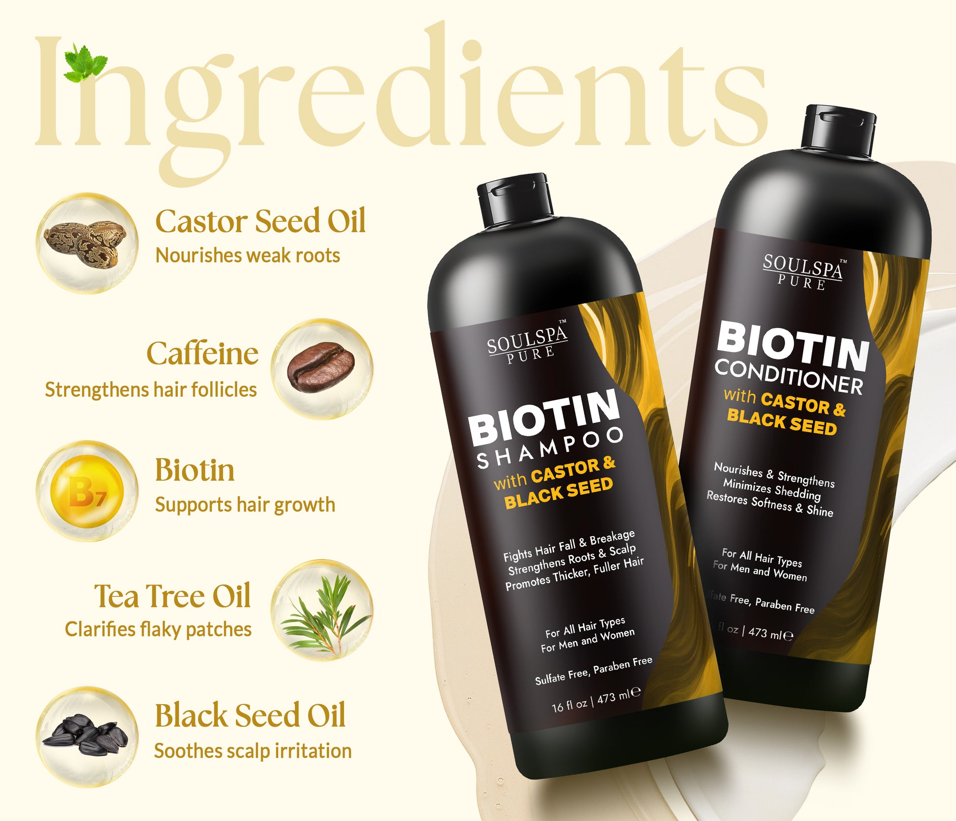 CONDITIONER: Purified Water, Stearyl Alcohol, PEG-40 Hydrogenated Castor Oil, Stearamidopropyl Dimethylamine, Behentrimonium Chloride, Cetyl Acetate, Cyclomethicone, Lactic Acid, Polyquaternium-10, Sodium Benzoate, Caprylyl Glycol, Potassium Sorbate, Passiflora Incarnata (Passion Flower) Extract, Aloe Barbadensis Leaf Juice, Hydrolyzed Silk Protein, Biotin, Caffeine, Melaleuca Alternifolia (Tea Tree) Oil, Ricinus Communis (Castor) Seed Oil, Nigella Sativa (Black Seed) Oil, Melissa Officinalis (Balm Mint) Extract, Serenoa Serrulata (Saw Palmetto) Fruit Extract, Silk Amino Acids, Simmondsia Chinensis (Jojoba) Seed Oil, Cocos Nucifera (Coconut) Oil, Niacinamide (Vitamin B3), Tocopheryl Acetate (Vitamin E)SHAMPOO: Purified Water, Sodium C14-16 Olefin Sulfonate, Sodium Lauroyl Sarcosinate, Cocamidopropyl Betaine, Polyquaternium-10, Sodium Benzoate, Caprylyl Glycol, Potassium Sorbate, PEG-40 Hydrogenated Castor Oil, Propylene Glycol, Phytic Acid, Sorbitan Oleate, Cocoyl Hydrolyzed Keratin, Biotin, Caffeine, Melaleuca Alternifolia (Tea Tree) Oil, Melissa Officinalis (Balm Mint) Extract, Serenoa Serrulata (Saw Palmetto) Fruit Extract, Mentha Piperita (Peppermint) Oil, Ricinus Communis (Castor) Seed Oil, Nigella Sativa (Black Seed) Oil, Silk Amino Acids, Simmondsia Chinensis (Jojoba) Seed Oil, Cocos Nucifera (Coconut) Oil, Zinc Chloride, Niacinamide (Vitamin B3), Tocopheryl Acetate (Vitamin E).